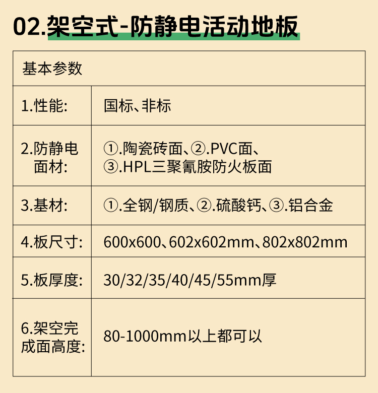 直铺式,架空式铺装(也就是陶瓷面架空活动地板需加厚或者复合基材);